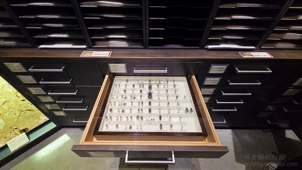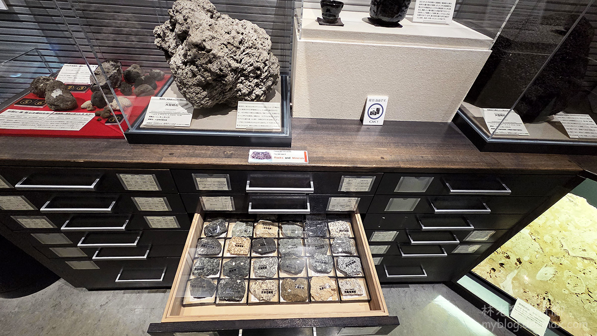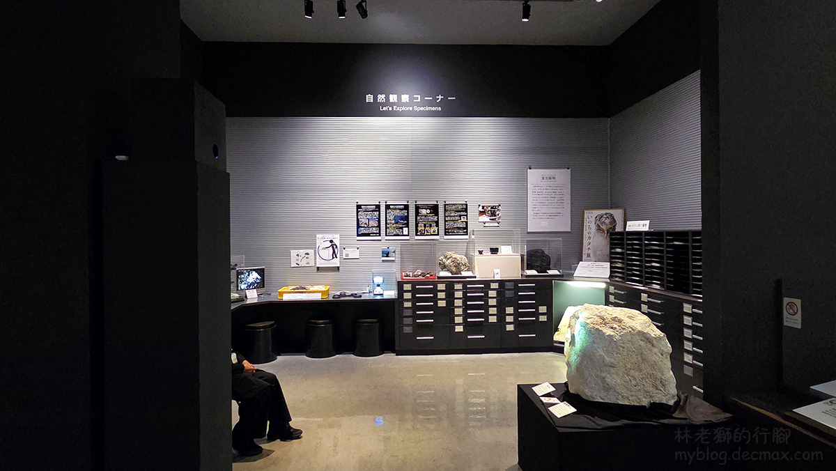 另外還設置了一個自然觀察區,層櫃裡展示許多岩石、植物、昆蟲標本,可近距離觀看。