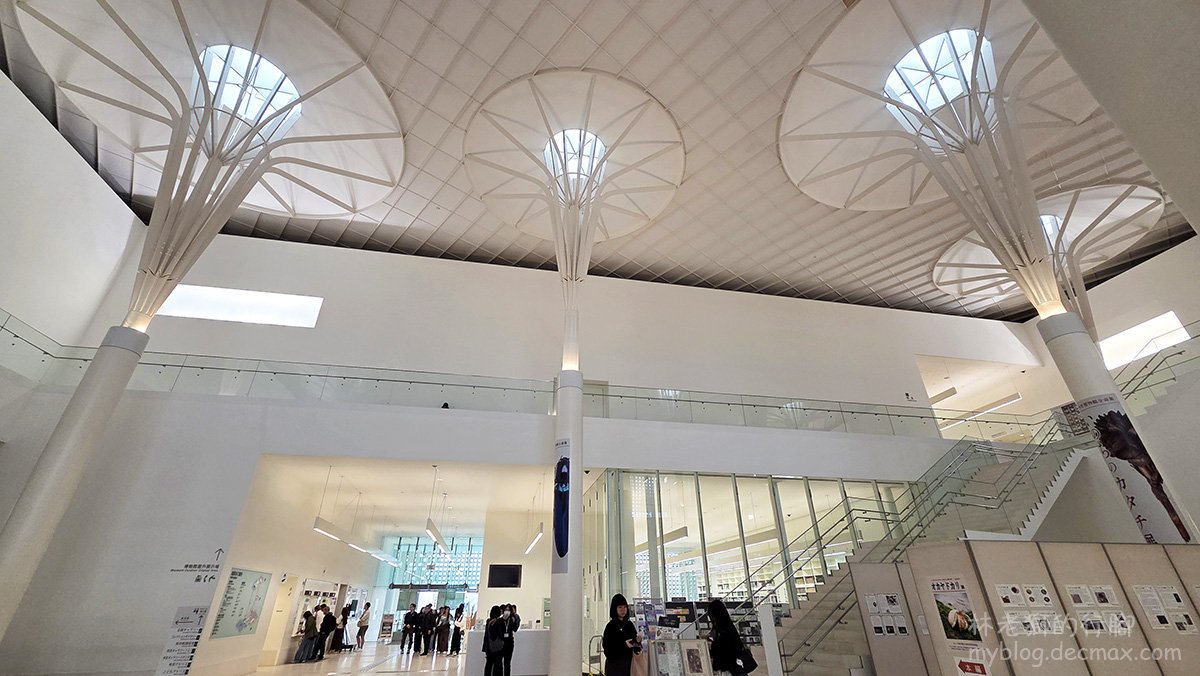 ▲館內空間挑高設計,三層樓高的傘狀白柱是由在沖繩隨處可見的檳榔樹所轉化而來的意象設計,導入了自然光讓白色為底的空間更顯溫暖透亮。
